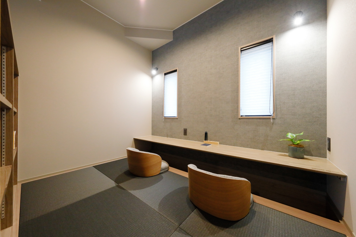 寝室の横には、段差でゆるやかに区切られた小上がりの書斎を配置し、足をゆったり伸ばせる掘りごたつ式カウンターで落ち着いて作業できる空間をつくりました。